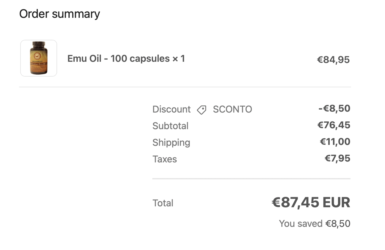 Più video guardavo, e più il prezzo passava in secondo grado. Prendersi cura di sé stessi è l’atto d’amore più grande. Ho cercato per molto tempo questo prodotto ma, purtroppo non era disponibile né in Italia né in Europa perché l’emù viene allevato solamente in Australia. Per cui ho contattato l’azienda produttrice che mi segnalò il loro unico fornitore in tutta Europa. Il costo per una confezione di 100 capsule è di 84 euro. Il mio primo ordine è stato di due confezioni, questo è per risparmiare sulla spedizione.